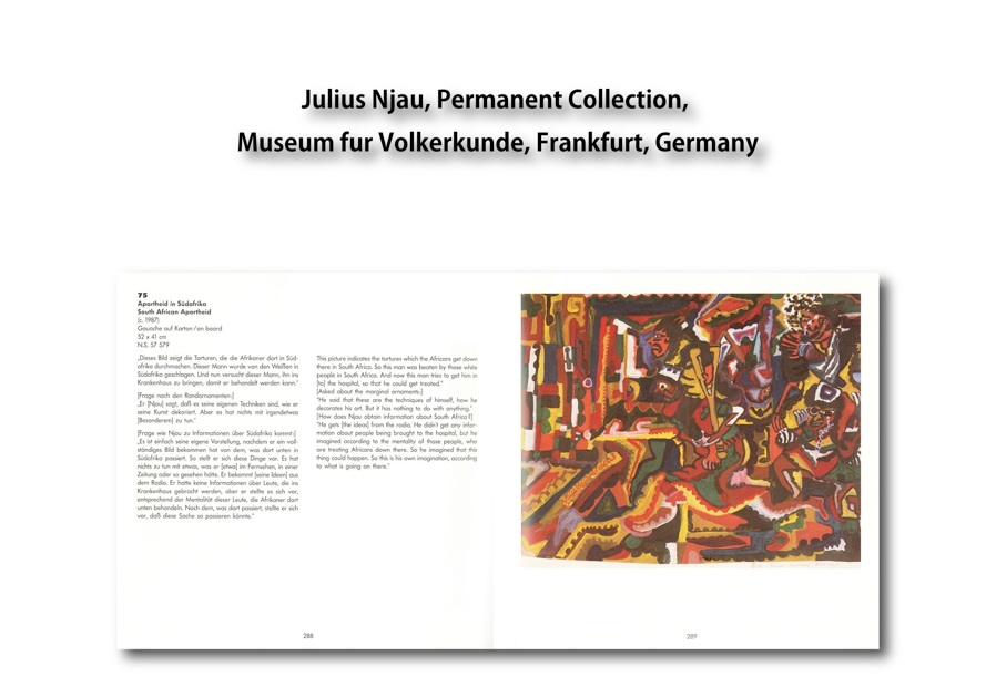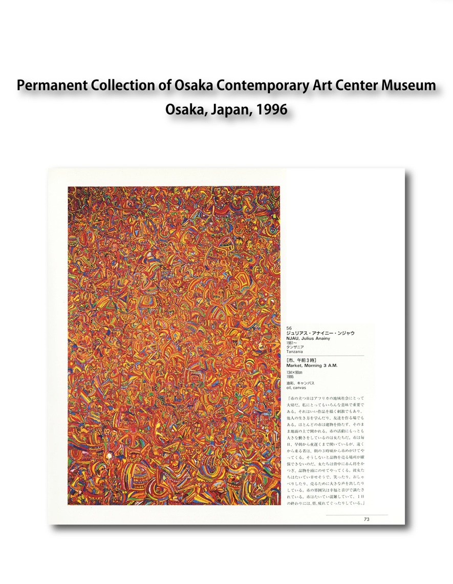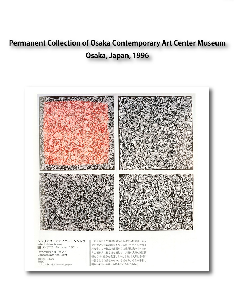 Julius Njau is popular as a contemporary artist in oil painting but he pursues other various kinds of expression such as engraving, batik and sculpture. He has so far painted more than 1,000 works. Some of his works were completed within 5 days or a week, others could take more than a month. Among those of his works which he finished so concentrated that he forgot to sleep or eat, some were inspired by his dreams. Many of his works were awarded prizes in competitions and they are collected in museums in Osaka, Toyama, Germany, Finland and the United Kingdom.