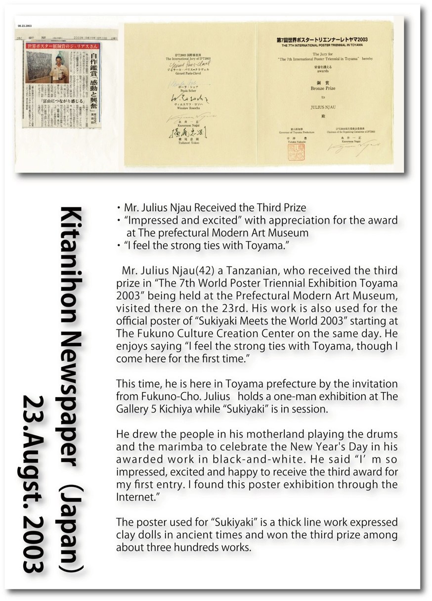 In 1983, His first exhibition was held in Helsinki, Finland. After that, He had a lot of exhibitions in Denmark, Norway, Sweden, Spain, Kenya and Japan not to mention his mother land, Tanzania. He is now active world wide as a promising artist.