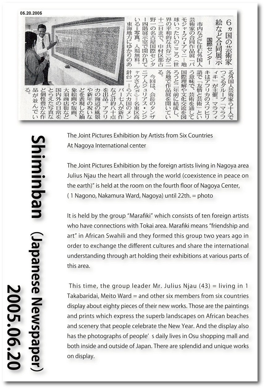 As can be seen in the painting “Market”, his basis as an artist includes the keyword “communication”. In 2003 he established the group of “Marafiki” (“friendship” in Swahili) with 10 foreign artists living in Japan in order to enhance international understanding and cultural exchange. The concept of this group implies “Friendship and Art”. “I feel more than happy to make friends through art. If I did not pain pictures, what chance would I have had to meet you?”